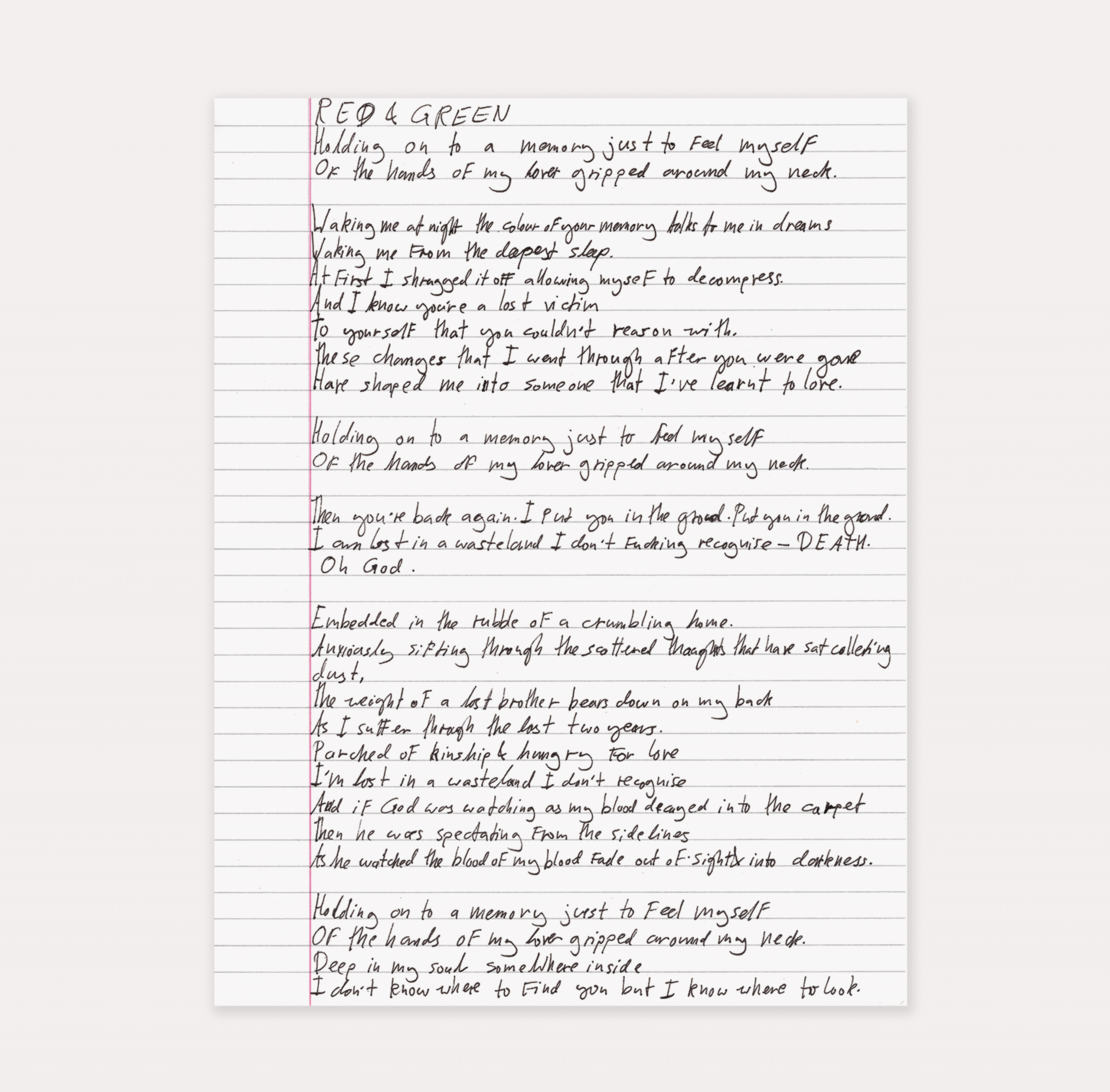 1 of 11 hand written lyric sheet of one of the tracks from “Death & Connection”, written by the lyrical composer of the song,